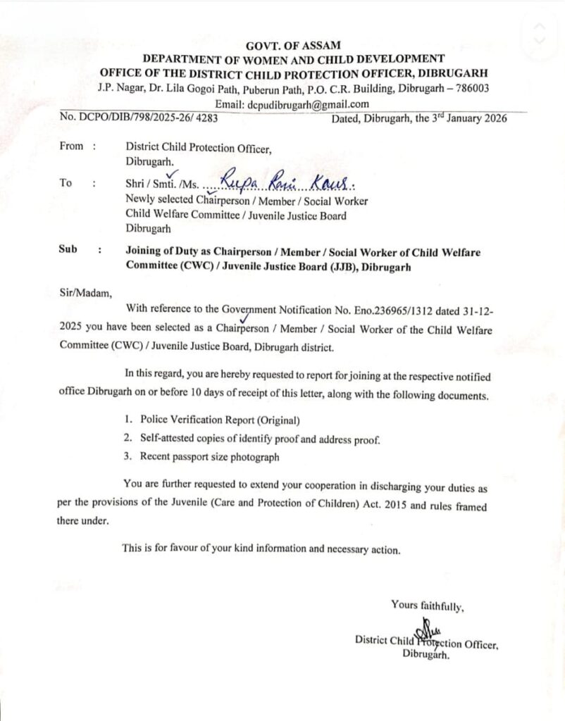 The appointment was made on January 3, 2025, by the State Child Protection Society, Government of Assam, Guwahati. She will serve a three-year tenure as Chairperson.